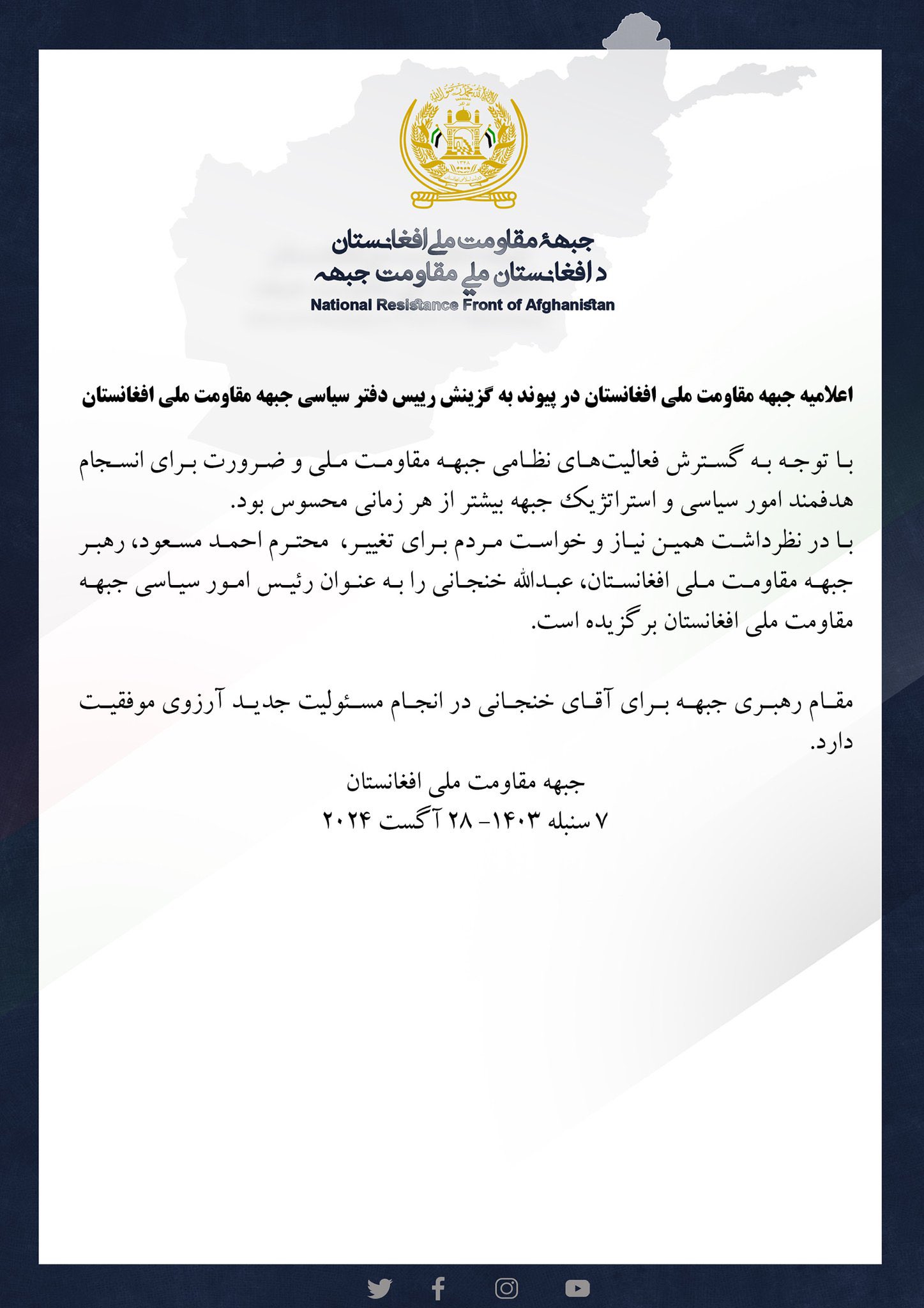با در نظر‌داشت همین نیاز و خواست مردم برای تغییر، محترم احمد مسعود، رهبر جبهه مقاومت ملی افغانستان، عبدالله خنجانی را به عنوان رئیس امور سیاسی جبهه مقاومت ملی افغانستان برگزیده است.